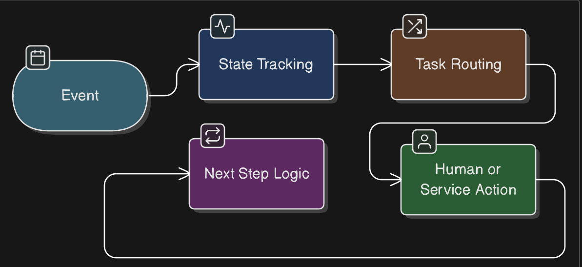 These engines are valuable because they reduce chaos and enforce consistency. But they’re also rigid. Every exception means new modeling, new swimlanes, new brittle integrations.