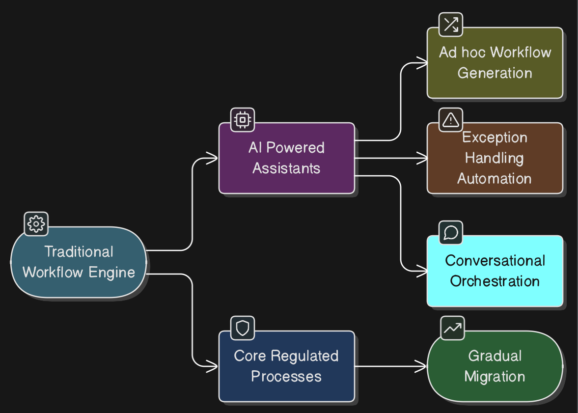 - Short-term: Workflow engines remain for core, regulated, repeatable processes (claims, onboarding, payments).